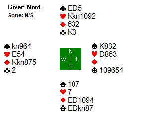 Christian Bakke la liten, og spilte hjerter til knekten på hånda. Øst stakk med dama, og skiftet til liten spar. Den gikk via nieren i vest til dama på hånda. Nå kunne Christian presse ut hjerter ess, og fikk hele elleve stikk da spillet så slik ut: