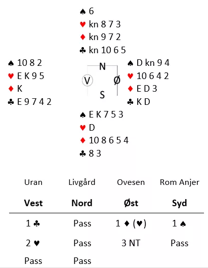 Etter sparinnmeldingen unngikk vi 4H som (nesten) alltid går beit. Sluttkontrakten 3NT var allerede et godt utgangspunkt for en solid pluss, men Jo Arne Ovesen så tidlig at Nord ville få det svært tungt da ruter 4 i utspillet indikerte at syd satt med lengde i spar og ruter. .