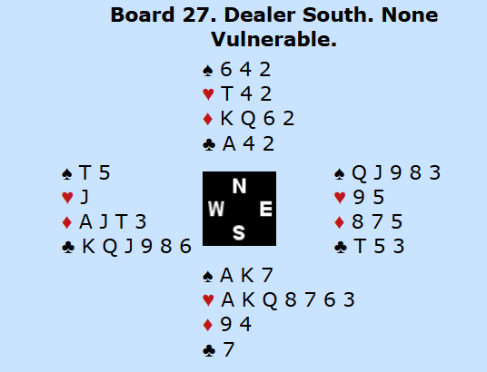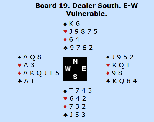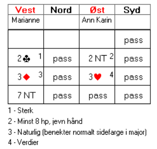 2 grand viste altså minst 8 honnørpoeng, men om det skal meldes på minimum styrke må man ha rene honnører, det vil si ikke bare damer og knekter. I og med at Marianne har alle essene, tyder det på at makker må ha minst et par konger og ei dame. I så fall bør det være minst tolv sikre stikk, og trolig finesse- og/eller skvismuligheter for å få tak i det trettende stikket. Marianne mente det så vanskelig ut å få kontroll på meldingsforløpet i en slik grad at man kunne melde storeslem med full kontroll. Dermed valgte hun å ta sats og melde 7 grand.