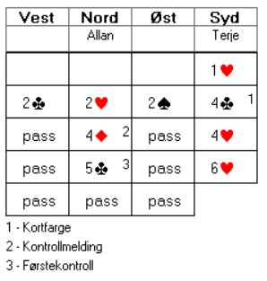 Allan og Terje meldte fint fram til 6 hjerter. 4 kløver er kortfarge og sleminteresse. 4 ruter fra Allan er kontrollmelding som samtidig forteller om at kortfarga i kløver ikke er helt uinteressant. Allan finner så ei god melding når han går på en gang til med 5 kløver. Det viser førstekontroll og ytterligere interesse. Husk at Terje har indikert sleminteresse mot en enkel høyning, som viser omtrent 6-9 hp. Dermed kan Allan nesten ikke ha bedre kort (om man ser bort i fra at han kunne hatt dobelton spar).