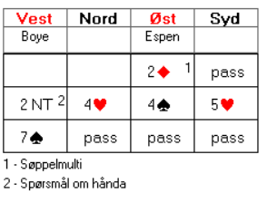 Jeg er usikker på hva som er forskjellen på pass og 2 spar over nords dobling, men øst bør i alle fall ikke avgi den minst oppmuntrende meldinga i den situasjonen.