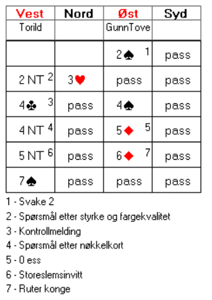 Slik meldte Ann Karin og Marianne. 2 hjerter viser en god løft i spar etter syds opplysende dobling. Jeg må si jeg har litt sympati for at Ann Karin nedvurderer si hånd med single ruter konge. Samtidig er det slik at nords dobling kan tyde på at motparten har hjertertilpasning, og dermed er det betimelig å håp at makker i vest har relativt få hjerter. Om hun i tillegg har hjelp i kløver, skal det ikke så mye til før det er spill for utgang. Det er klart at man kan være noe mer sårbar om det bare er 3-korts spar i vest, men faktisk kan så lite som dama tredje i spar og ess-dame fjerde i kløver gi godt spill for utgang.