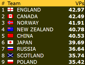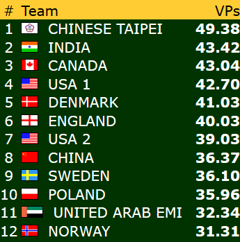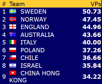 Etter 15 runder spilt torsdag er Norge nr 9 i åpen klasse mens damene ligger på en flott 4. plass mens veteranlaget nå ligger helt nede på 19. plass. 8 runder gjenstår og vi kan med flaks være kvalifisert for sluttspill i minst en gruppe- håpet er klaff i to!