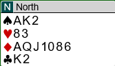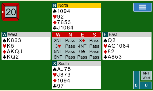Jeg er usikker på hva alle meldingene betyr, men 2 grand viser 20-21 hp og 3 ruter er overføring til hjerter. Nå kan jeg tenke meg at 4 gran er kvantitativt (invitt til lilleslem). Trolig tar 5 grand imot og er på utkikk etter en eventuell 4-4-tilpasning i minor, mens 6 kløver viser 4-kortsfarge.