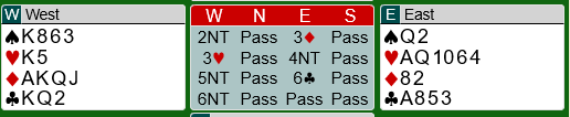 Liv Marit (nord) og Bodil meldte seg opp i 6 hjerter etter en renonsvisende splintermelding i nord. 5 hjerter viste så to av fem ess uten hjerterdama. Utspillet var spar dame, som gikk til stjeling i bordet. Bodil fortsatte med ruter til stjeling, kløver til knekten og ny ruter til stjeling. Da kongen kom på fra øst sto kontrakten nå bare på at hjerteren var jevnt fordelt. Hjerter konge og hjerter til esset ga gode nyheter, og nå var det bare å pumpe stående ruter fra bordet. Vunnet lilleslem og 11 IMP til Norge da Nederland stoppet i utgang ved det andre bordet.