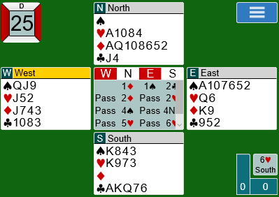 Noen spill senere var det naturlig å melde slem øst-vest. Her ser du meldingsforløpet til Ann Karin (øst) og Marianne:
