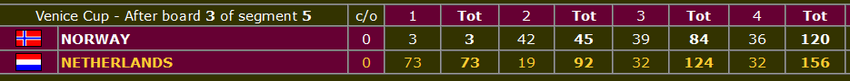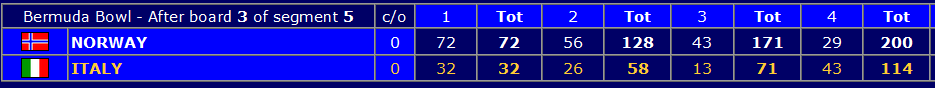 I Bermuda Bowl er USA 1 i trøbbel mot England som har med (litt norske) Artur Malinowski. Kina ligger også under i sin kamp som er mot Polen. I øyeblikket ser det altså ut til at det kan bli en hel-europeisk semifinale i den klassen! Men for all del, det er 32 spill igjen så mye kan skje fortsatt.
