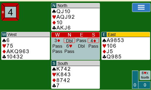 La oss si meldingene går omtrent slik: 1 hjerter fra syd, 1 spar fra vest, 3 hjerter fra nord, 3 spar fra øst, og vest avslutter meldingene med 4 spar over syds 4 hjerter. Ett sted gikk meldingene 1 hjerter (syd), dobler fra vest, 3 hjerter fra nord, dobler fra øst (!), 4 hjerter fra syd og 4 spar fra vest med pass rundt.