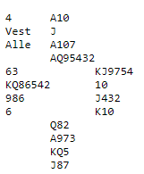 5 av 13 bord kom her i slem, ikke urimelig med gode langfarger og 14+ 17 hp. 6 NT med 12 stikk ga +7, men best var Trond Juliussen (N)- Tommy Blom (S) som kom i 7 grand! 1 ruter fra Nord- svar 2 kløver fra Syd og gjenmelding 2 NT fra Nord før Tommy dro til med Blackwood for ess og konger og satset på at storeslem sto!