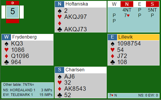 Lederparet på butleren i 2.divisjon, Hoftaniska-Charlsen meldte altså slik og kom i 7 hjerter. Andre sa 7 grand, men i lagkamp gir jo ikke forskjellen på 2220 og 2210 noe utslag. Et argument mot 7 hjerter er dog at det kan jo hende det kommer utspill til stjeling i sidefargen kløver, men å si 7 hjerter er ok. I parturnering eller Board-A-Match er jeg imidlertid sikker på at Hoftaniska ville sagt 7 grand.