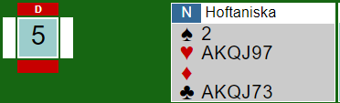 Joda, det ble forsåvidt en fin score, +950 for 5 ruter doblet med ett overstikk. Men er det nok? Det står jo i 6 ruter, så det kan godt hende man taper sånne spill.
