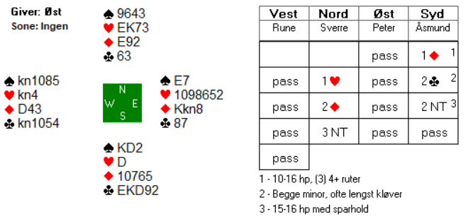 Åsmund fikk vist akkurat hva han hadde, og dermed var det ikke vanskelig for Sverre å lette til utgang. Det var naturlig for Sverre å nøye seg med 2 ruter i andre melderunde da 2 kløver i utgangspunktet er å betrakte som 11-14 hp. Om makker har mer enn det, melder han en gang til over 2 ruter.