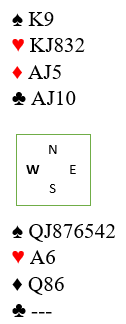 Kunststykket er å spille ut trumf fra Vest som deretter kan komme inn på minor ess og så spilt nok en trumf. Men stopp en halv- du vinner jo utspillet med sp 10 og spiller den single hjerteren. Stikker Øst opp med esset trenger du etterpå bare å stjele en hjerter og det har jo makker igjen. Men legger Øst lav hjerter i 2. stikk vinner kongen og du får stjålet hj7, spilt en minor til Vest og nå rekker man bare å spille en runde trumf for du også får stjålet hj 8 og klarer dine 10 stikk.