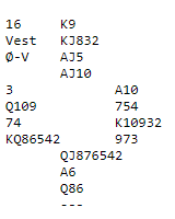 Merkelig å passe med såpass mye kort tenkte jeg. Men det var konstatert at makker med sitt ene honørpoeng likevel hadde en drømmehånd å tilby. Kl D ble stjålet fulgt av hj D som Øst stakk men så var det slutt, for makker hadde trumfer å kunne stjele de to små hjerterne med. Opp med Howellslippen vi noterer resultatene på og der kunne vi konstatere delt nest bunn! Saken var at Vest med en beskjeden pass unnlot å doble oss. Det ble dyrt- for oss! Et par var presset opp, trolig etter dobling i 2. hånd, og ble betet i 5 spar. Men ser du at selv 4 spar kanskje kan betes?