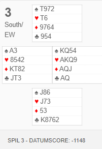 Denne gangen var hjerterkontrakt best, og siden hjerteren satt 3-3 vinnes tretten stikk greit. En spar kan stjeles hos vest, og østs kløver dame kan kastes på vests fjerde ruter.