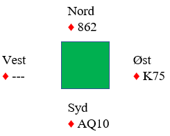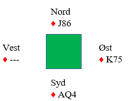 Dermed tapte spillefører tre (!) trumfstikk: ett til esset, en stjeling hos nord og til trumfknekten som sammen med spar ess ga en bet.