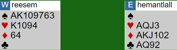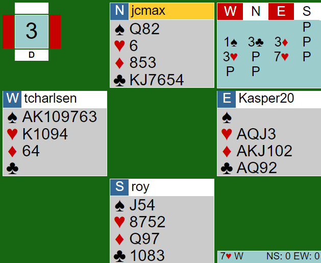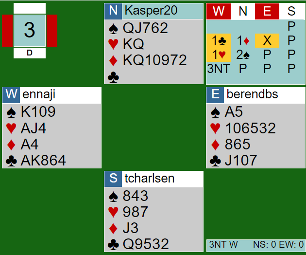 Øst visste de hadde 5-3 tilpasning i hjerter, men likevel passet han på 3 grand. Thor Erik (nord) spilte ut ruter dame. Thomas fulgte på med knekten og spillefører stakk andre gang før han spilte hjerter ess og mer hjerter i et håp om singel honnør hos nord. Ikke akkurat veldig inspirert spill, og det førte også til to bet ganske raskt, +200 til de Botton. Ved det andre bordet spilte Hackett-Hydes 4 hjerter som ble vunnet, 13 IMP.