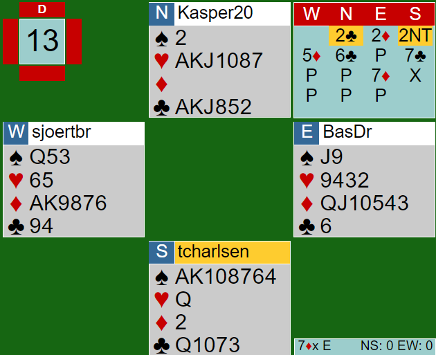 Thor Erik og Thomas vurderte godt og meldte 7 kløver. Hvis de hadde fått spille den ville de notert +2140, spilleføringen ville vært en formalitet. Ø/V (Brink-Drijver) var imidlertid gode her og stampet i 7 ruter. Det kostet 1400, en kanonstamp mot 7 kløver som står. Hvis nord hadde visst at syd har hjerter dame kunne han meldt 7 hjerter, men det er umulig i praksis.