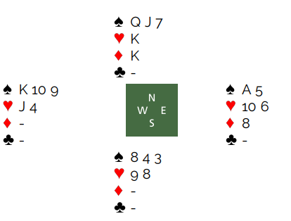 Det er en bra plan å spille på kløveren. Men det holder antagelig ikke om han legger ned en honnør. Vinnervarianten som selvsagt er vanskelig både å komme på og så velge er etter å ha vunnet med ruter ess i andre stikk spille liten kløver. Det kan unektelig være dumt om nord for eksempel har singel kløver dame. Men se hvilket fint spill han får om han gjør det. Hvis det går liten kløver til knekten og damen (syd gjør det bedre om han ligger unna) fulgt av hjerterskift. Vest vinner med esset og spiller kløver til tieren, kløver til finesse med åtteren og så to store kløver til. Dette blir situasjonen etter de stikkene: