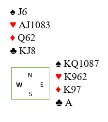 Sjansen er at vest har ruter dame. Idet øst er så «frekk» at han finner trumf tilbake og ødelegger plan A skifter du fot! Trumfen tas ut i tre runder (vest har tre hjerter, øst to). Så spilles ruter knekt. Det er ikke en finesse, for du mangler jo tieren. Men vest må dekke, gjør han ikke det lar du knekten seile og tar elleve stikk (ruteren går i så fall om knekten vinner stikket) idet hele spillet ser slik ut fra start: