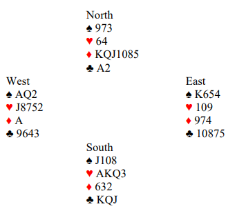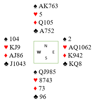 Altså har ikke øst noen hjerterhonnør. Siden du vet at spillefører har AKQ i hjerter vet du også at han har minst ni stikk så snart han kommer inn med tre stikk i hjerter, fem ruterstikk og kløver ess. Det går altså ikke å bete denne utgangen med å spille mer hjerter eller skifte til kløver. Eneste betesjanse er i spar, og det skal ikke mer til enn at makker har kongen fjerde.