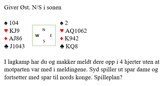 Først tenk gjennom hva du kan forvente hos makker. Han (øst) har ca. 3-5 poeng (spillefører har jo 14, 15 eller 16). Du vet ganske sikkert at makker har hjerter 10, for om syd har tieren ville han (normalt) stukket med det kortet, ikke esset. Derfor ser det ved første øyekast «safe» ut å spille mer hjerter, men det er helt feil motspill.