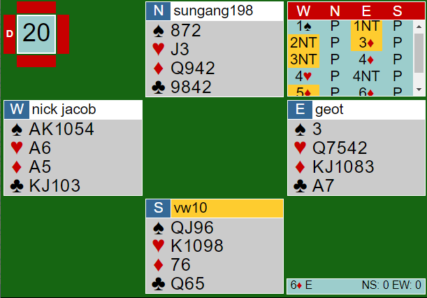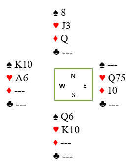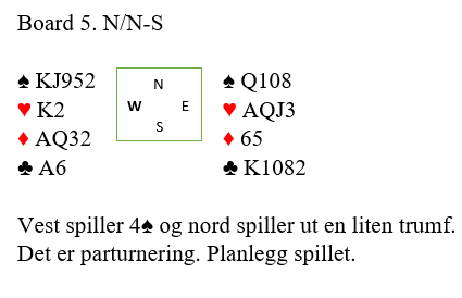 Syd spiller så ny ruter og kan dermed hente to stikk der. Har du plan for hvordan du la på dine rutere og ser du etter hva makker i Vest foretar seg? Hun sitter jo med minst ett stående stikk i spar og må ha 7-8 hp i alt men har jo alt vist sp DJ og ru A. Du ser resten, makker har ikke inntak , kan max ha kl J, og da må du sørge for at dere får så mange stikk som mulig.. Siste ruter tas Du må jo holde alle hjerterne dine for å bevare holdet men hvilken farge, hjerter eller kløver tror du at makker og du skal få stikk nok for å bete? Her kommer signalene inn. Du legger fra start lavt i ruter og viser styrke i kløver og da makker spilte opp sp 4 må det bety noe i kløver der også! Etter det siste stikket til i ruter saker du derfor kl 7. Hj D dekker du med kongen og Syd får for esset. Hj 7 løper så til 10-eren din og nå vet du at kløver ikke kan spilles fra kongen. Du spiller derfor hj 6 til bordet. Syd har nå et val på hvem av oss som har kl K. Spilles kl D dekker du og dere får et stikk uansett hva Syd gjør. Syd hadde fordeling 4-3-3-3 med AK i spar, hj A, ru D og kl A men ellers bare småkort. Han får bare 2+2+3+1 stikk. Bet altså. Men kunne ikke Syd bare stukket med hj J og spilt kløver til ess og ny kløver til din konge? Nei, her hadde Vest hj 9 og tas hj J avblokkerer du selvsagt hj 10 og det er makker som kommer inn. Og kan ta stikk i spar og kløver opp sikrer det 5. stikket vi får.