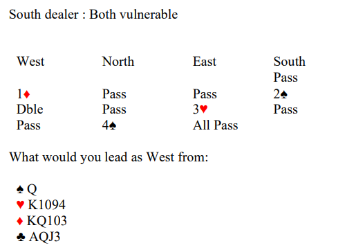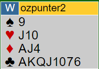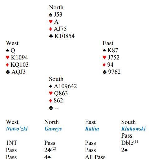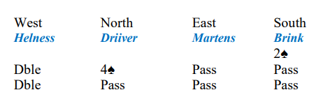Ved det andre bordet åpnet syd med 4 spar. Idet motparten var i 6 kløver doblet nord. Da syd kanskje litt tivlsomt (?) valgte å spille motspill ble det fattige +300 til N/S, og da ble spillet tapt med 18 IMP.