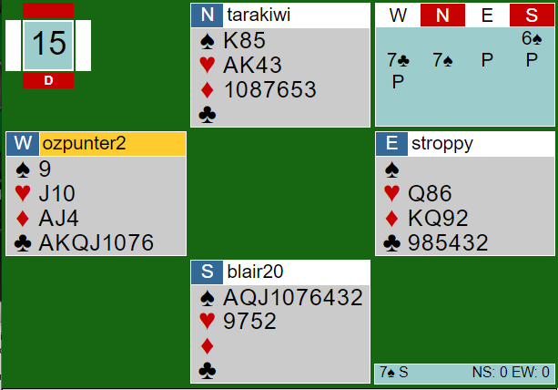 Michael Cornell (West) er «the grand old» man i NZ bridge, og han har nok sett det meste ved bridgebordet. Her var han veldig usikker, sa han, men han tok syds åpningsmelding på alvor og meldte 7 kløver. Da sa nord 7 spar, og etter to passer ga Michael opp og passet, og fokuserte heller på å finne et utspill enn å doble 7 spar.