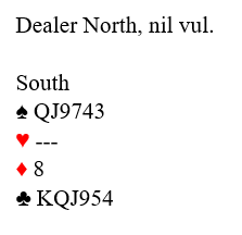 Det var et nytt makkerskap, og jeg var usikker på hennes stil når det gjelder hopp til 4 etter kun et 1-over-1 svar. Uansett måtte det være muligheter for slem. Å spørre med 4 grand (Keycard Blackwood) er ikke anbefalt med renons, men for å forsøke å gjøre det enkelt sa jeg likevel 4 grand. Da snudde de tre andre spillerne seg mot meg og sa i kor: