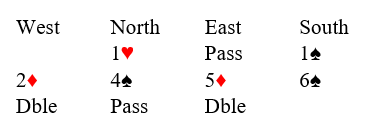 For et kaos, og jeg hadde startet det. I gamle dager var regelen slik at om begge doblet kunne spillefører velge å spille udoblet, en regel jeg aldri helt forstod. Om begge har mistro til sluttkontrakten virker det litt brutalt at de ikke skal få lov å doble når begge ønsker å gjøre det! Den regelen ble endret på et tidspunkt, og i vårt tilfelle ble kontrakten 6 spar doblet.
