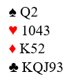 Han (eller hun) med disse gode kortene åpnet med 1 ruter og makkeren svarte 1 hjerter. Hva ville du meldt nå?