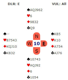 (Det er riktig som noen kansje har oppdaget at kontrakten går bet om det kommer to ganger kløver ut fulgt av ruterskift fra øst, fordi ruter konge sitter bak. Men det motspillet slipper man altså hvis vest ikke unaturlig spiller ut sin single hjerter. Og da er det veldig synd å gå bet fordi timingen blir feil, og det blir faktisk etter hjerter ut, to runder trumf og så i gang med hjerteren bet selv om ruter konge sitter i saksen!)