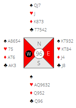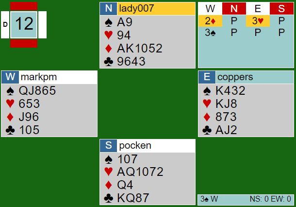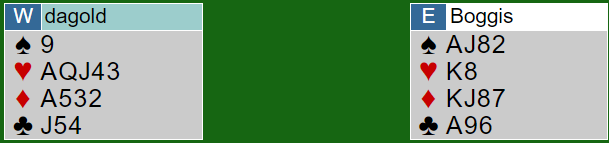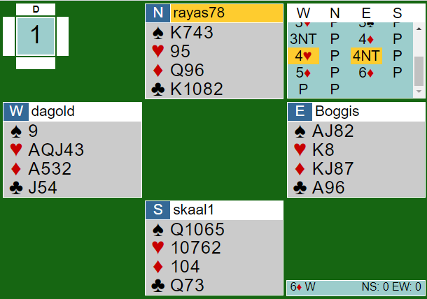 Det ender nok i 4 spar omtrent uansett hva øst gjør. Ved en del bord åpnet vest med 1NT, og da øst overførte til spar ble det til slutt 4 spar der også. Det var imidlertid en del par som spilte delkontrakt.