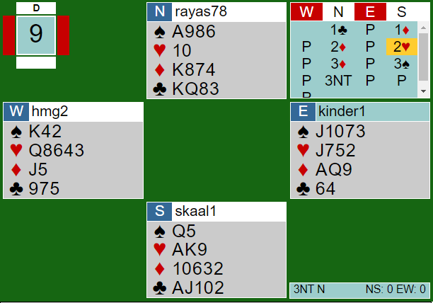 Ved mange bord kom hjerter knekt i utspill. Spillefører dekket med kongen og esset vant stikket. Nå ser det ikke helt unormalt ut å spille hjerter dame og nok en hjerter som nord kan stjele. Husk syd vet ikke at nord har sikkert trumfstikk uten stjeling. Det motspillet forærer spillefører ti stikk. I tredje hjererrunde kaster vest en ruter. Nord trumfer, men idet spillefører kommer inn kan han ta ut trumfen og kaste enda en ruter på den godspilte hjerter 10.