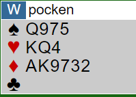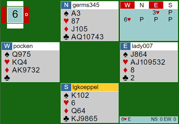 Nei, å melde "vitenskapelig" med slike kort er sjelden bra. Jeg tror det er best å enten si 4 hjerter, eller knalle til med 6 hjerter på direkten over 3 hjerter. Hvis du hopper til 6 hjerter er det en dobbelsjanse, enten står kontrakten enkelt hvis makker har sparkontroll, eller de finner ikke utspillet. Gjør de ikke det vil som regel ruterfargen blir mulig å godspille og gi nok stikk Tross alt har syd tre sidefarger å velge mellom i utspillet, og kanskje har han et ganske naturlig trumfutspill også.
