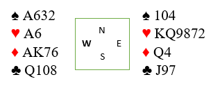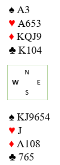 Det er vel enkelt, 6 hjerter av Nord så klart. Da er sp K beskyttet og uten spar ut blir det lett 13 stikk! Arne Marthinussen (N) var det etter litt pokeraktig meldesekvens av undertegnede. KL 9 ut løp til 10.eren, trumf til aeest og Vest var utsolgt. Hadde slevsagt ikke 4- kort i kløver og Øst med sp AJ10- hj DJ2. ru D87654- kl 8 fikk beten og 80% score. Surt, men slik skal også bridge være.