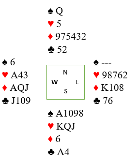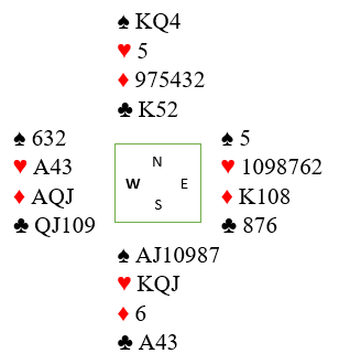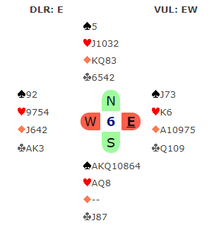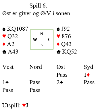 Da spillet forekom, i 4 spar ved mange bord, og i 5 spar ved enkelte bord var flere spilleførere for raske på labben og startet med å ta ut trumfen. Det er en typisk feil som ofte skjer når man har veldig fet og god trumffarge, det ser liksom så enkelt ut, og å ta ut trumfen med det samme er jo i mange spille riktig spilt. De glemte å stille seg det viktige spørsmål som alltid bør stilles før en går i gang å spille trumfkontrakt: «kan jeg ta ut trumfen nå med det samme, eller må jeg vente med det fordi jeg skal bruke trumfen til noe?». Svaret kan være «nei» på det spørsmålet hvis trumfen på den ene siden, ofte den korteste trumfhånden må brukes til å trumfe opp en eller flere mulige tapere. Slik så hele spillet ut: