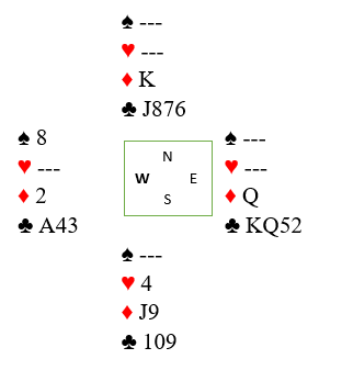 Hvis syd hadde hatt tre små hjerter, eller esset tredje ville det vært enkelt for de fleste å se at syds små hjertere burde trumfes hos nord. I dette spillet ser alle at nords single hjerter ikke har noen verdi for å kunne trumfe hjerter, men den single hjerteren har en annen verdi. Den gjør at syds hjerter gir avkast hos nord Fra nord skal jo kløver kastes på hjerter for å unngå kløvertaper, men det må uansett gjøres noe med syds (hovedhåndens) tredje kløver. Den må trumfes hos nord. Derfor må du vente litt med trumfen.