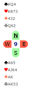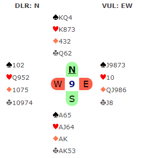 Her et spill som egentlig tvang seg fram, men se på hva Tom Gjøs i Syd skulle spille ut fra, og hva ville du gjort? Arne Marthinussen i Vest hadde åpnet med 1 ruter, pass fra Lars Helgesen i Nord og 1 NT (6-9/10 utren major 4- farge) og så gjenmelding 3 ruter fra Arne som undertegnede løftet til 3 grand med to ess, det burde rekke selv om majorbeholdningen var skral..