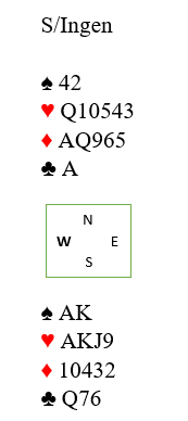 Vi tenker oss altså at under esset fulgte de med åtteren og syveren. Du spiller deg over til syd og spiller liten ruter mot nord. Så lenge øst ikke har K-J tredje fra start (uløselig kombinasjon for deg) må vest nå følge med enten knekten eller kongen og begge deler gjør at du har sikret deg at det blir kun en rutertaper.