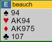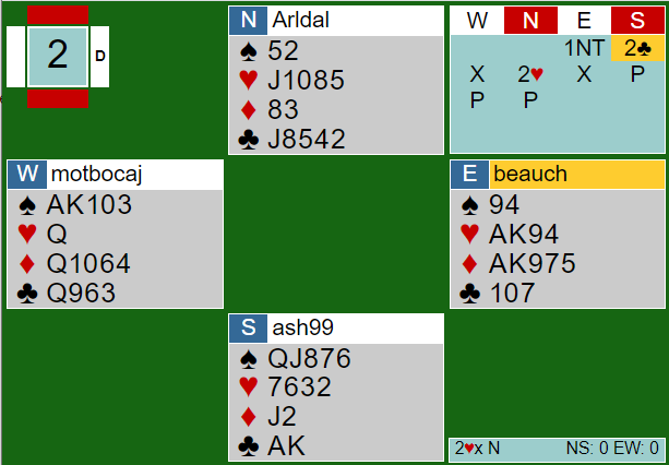 Brogeland (syd) var i 4 spar. Han fikk ikke noe skarpt motspill mot seg da vest tok to hjerterstikk før han skiftet til kløver 6, og øst satte i kongen. Da spilte nordmannen simpelthen spar til esset og spar dame, og forsvaret kunne ikke få for mer enn trumfkongen, N/S + 620.