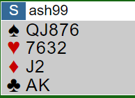Han vant med ruter ess og la ned kløver ess. Den første (lille) sjansen er da at kløver konge faller. Det skjedde ikke, og da måtte han spille hjerter for å kvitte seg med rutertaperen. Det lykkes om hjerter sitter 3-3, men det er også sjanser om han som har kløver konge singel igjen (kongen dobbel opprinnelig) er den som har kun to hjerter hvis den fargen sitter 4-2. Dessuten går det bra om en motstander har singel trumf og dobbelton hjerter også. Slik så hele spillet ut: