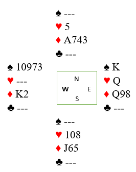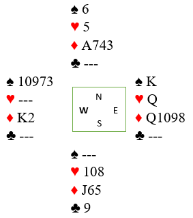 Øst får både for kløver konge og kløver dame i neste stikk, og nord vinner med kløver ess i tredje stikk. Vest hadde dobbel kløver fra start og kastet en spar i tredje kløverrunde.