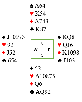 Uansett, kontrakten ble 4 spar spilt av nord ved vårt bord.