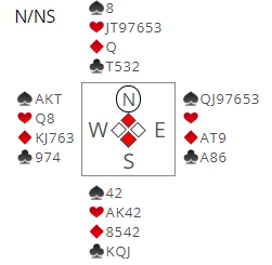 I dette spillet er det såkalt dobbel-tilpasning begge veier, dvs. de to sidene har hver sine to farger med god tilpasning. Da er det som regel veldig mange stikk i begge sidenes kontrakter. Her er det faktisk tretten stikk i sparkontrakt Ø/V. Det er imidlertid ikke så lett å melde slem, spesielt ikke med så friske meldinger fra N/S.