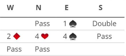Siden syd hadde doblet opplysende kunne nord ganske trygt hoppe til 4 hjerter, han visste jo om en viss hjertertilpasning. Øst meldte 4 spar, og der stoppet de.