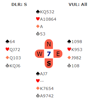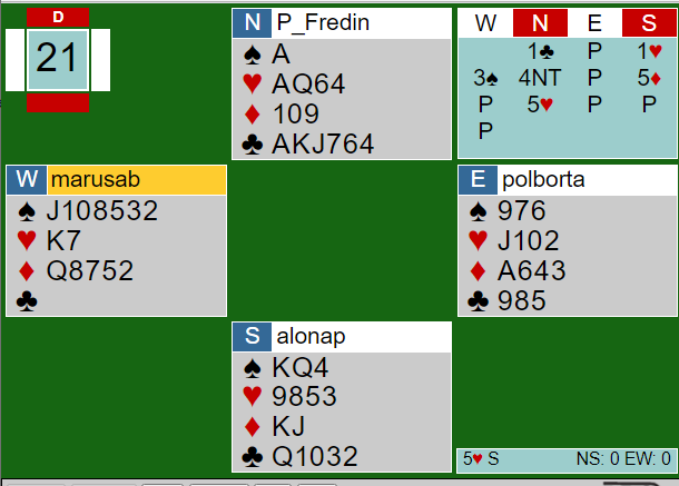 Nå viste hoppet til 4 hjerter kortfarge, men jeg vil tro det også lover fire-korts trumf uten at jeg er helt sikker på avtalene deres. Ok, hun manglet en trumf, men tenkte vel at det kompenserer en del at kortfargen ikke bare er en singelton, men renons. Og honnørene ellers er det all grunn til å like. Uansett, det må vel være lov å si at dette var temmelig tøffe tak?