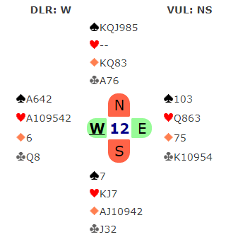 Over 2 hjerter syntes Bakke han var litt for sterk for kun en innmelding, og doblet. Da øst støttet til 3 hjerter fikk Brogeland sagt 4 ruter frivillig. Bakke sleminviterte med 4 hjerter, og da øst stampet i 5 hjerter doblet Boye. Men Bakke trodde på slem og sa 6 ruter.