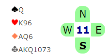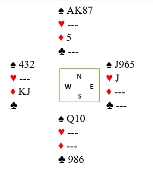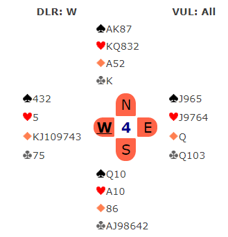Etter 1 kløver – 1 hjerter (som viste spar) reverserte (sterkt) vest med 2 ruter (tilsvarende 1 kløver-1spar, 2 ruter for de som ikke bruker såkalte kløverføringer). 2 ruter viser normalt fire-korts farge og sterke kort, og planen var å få krevd slik at åpneren kan finne ut mer om svarhåndens kort. Da sa øst 2 hjerter, fjerde farge som uten en revers normalt er kunstig krav til utgang. I denne meldesituasjonen – etter en reversmelding – er det imidlertid et behov for andre regler…